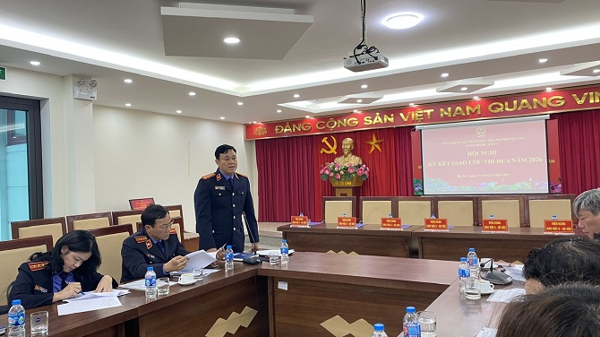 Phát biểu tại Hội nghị, đồng chí Phùng Xuân Giang – Viện trưởng Viện KSND khu vực 5 – Hà Nội (Cụm trưởng Cụm thi đua số 1 – Viện KSND thành phố Hà Nội năm 2026) nhấn mạnh: Việc Cụm thi đua số 1 – Viện KSND thành phố Hà Nội tổ chức Hội nghị ký giao ước thi đua nhằm phát huy tinh thần đoàn kết, đóng góp vào sự phát triển của ngành Kiểm sát nhân dân nói chung và Viện KSND hai cấp Thành phố nói riêng, tiếp tục phát huy những thành tích đạt được, nỗ lực phấn đấu cao nhất để thực hiện thắng lợi nhiệm vụ chính trị của Ngành, hưởng ứng các phong trào thi đua năm 2026 với chủ đề phong trào thi đua “Đoàn kết, đổi mới, trách nhiệm, vượt khó, hiệu quả, hoàn thành xuất sắc nhiệm vụ năm 2026”, do Viện trưởng Viện KSND tối cao phát động. Năm 2026, hứa hẹn sẽ là một năm Cụm thi đua số 1 có phong trào thi đua sôi nổi bởi tất cả các đơn vị trong Cụm đều đăng ký danh hiệu đơn vị đạt “Cờ thi đua dẫn đầu khối ngành KSND” và tất cả các đơn vị đều có từ 55 – 100% cán bộ đăng ký đạt danh hiệu “Chiến sĩ thi đua cơ sở”.