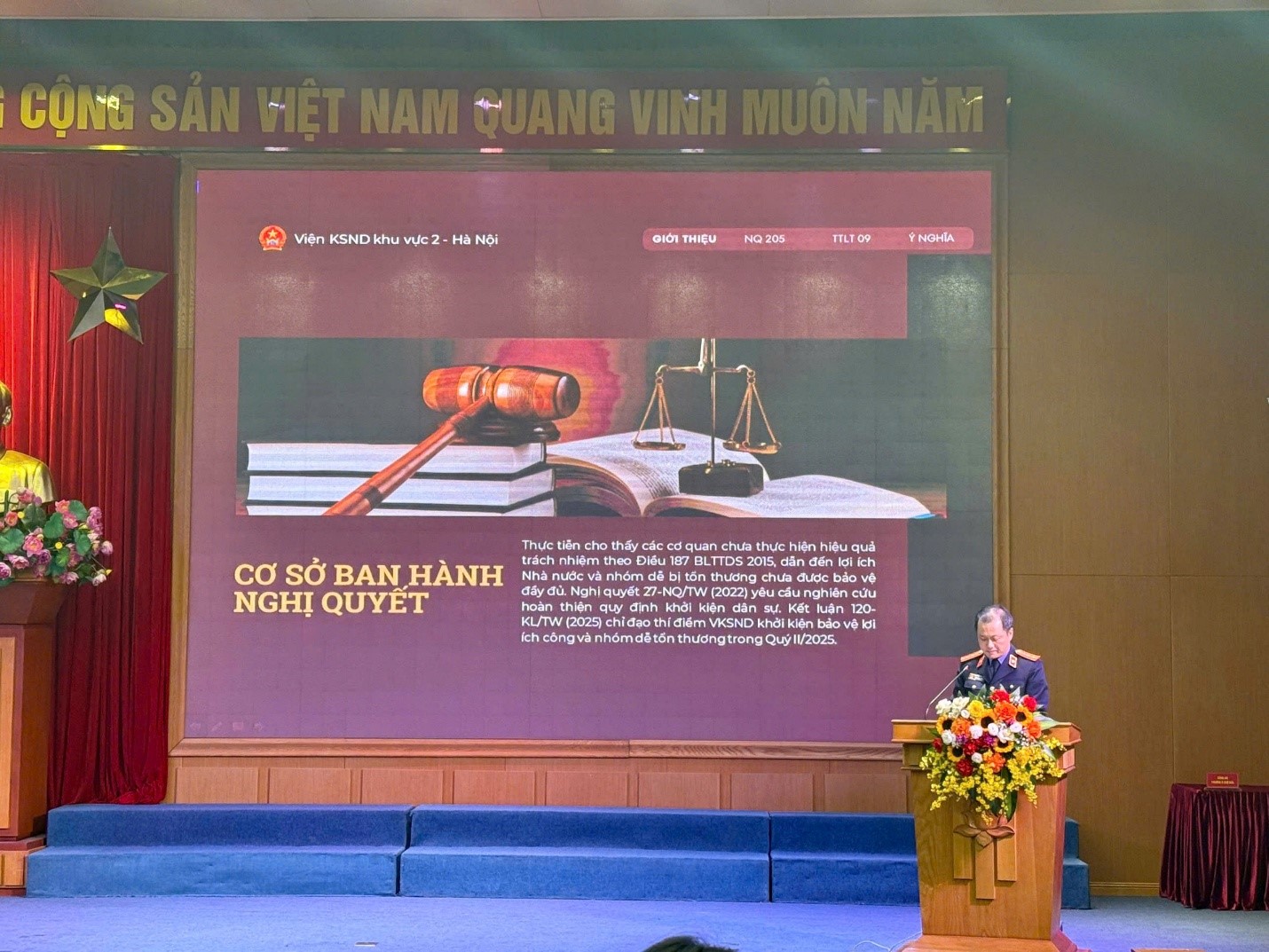 Trong khuôn khổ nội dung Hội nghị, đồng chí Trần Lương Tuấn - Phó Viện trưởng Viện KSND khu vực 2 đã trực tiếp phổ biến các quy định thông qua việc ứng dụng công nghệ thông tin trình chiếu những nội dung Nghị quyết 205/2025/QH15 ngày 24 tháng 6 năm 2025 của Quốc hội đối với việc thí điểm khởi kiện các vụ án dân sự liên quan đến các chủ thể là nhóm dễ bị tổn thương hoặc bảo vệ lợi ích công.