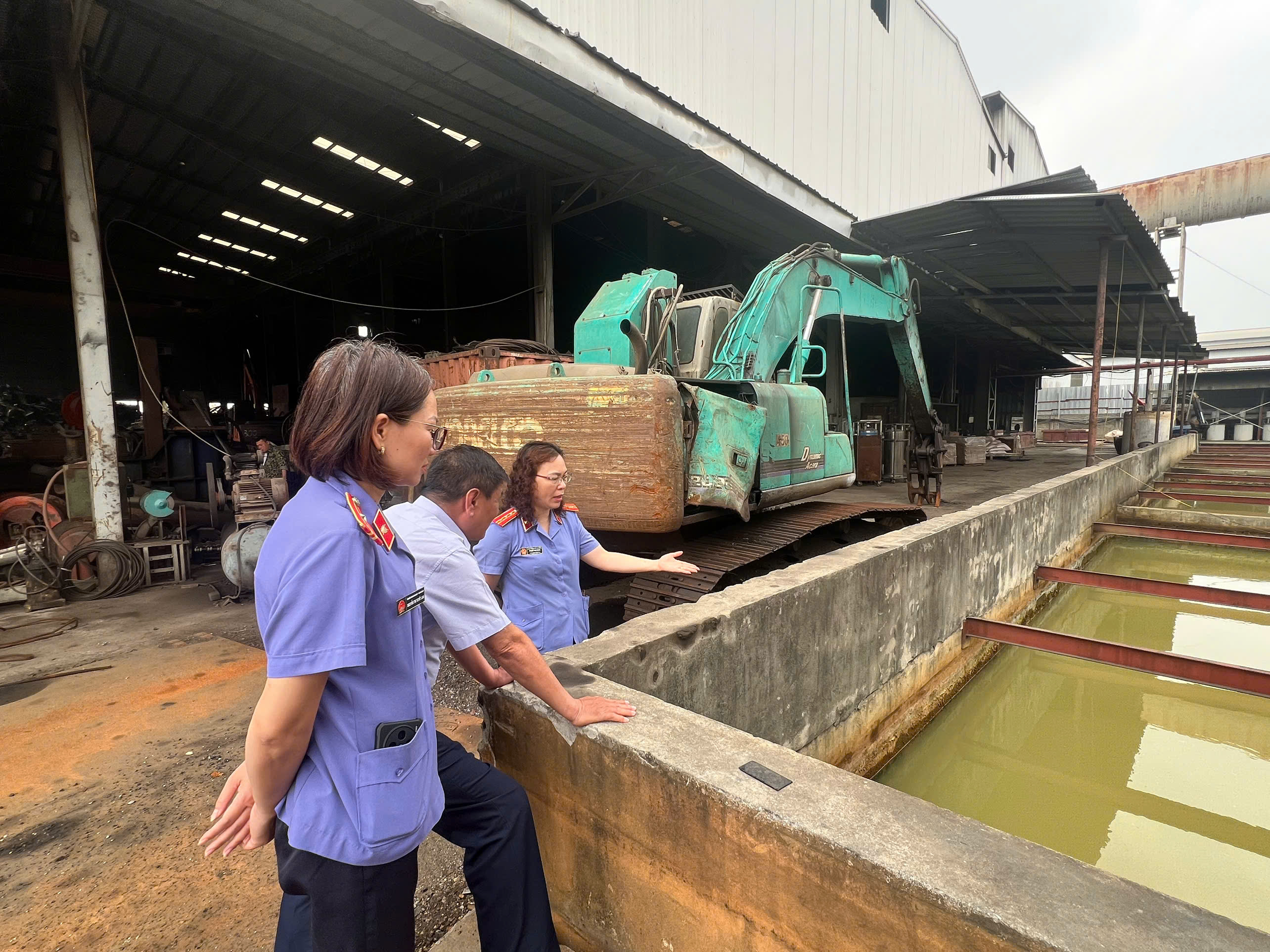 Đoàn công tác trực tiếp xác minh bể nước thải của doanh nghiệp