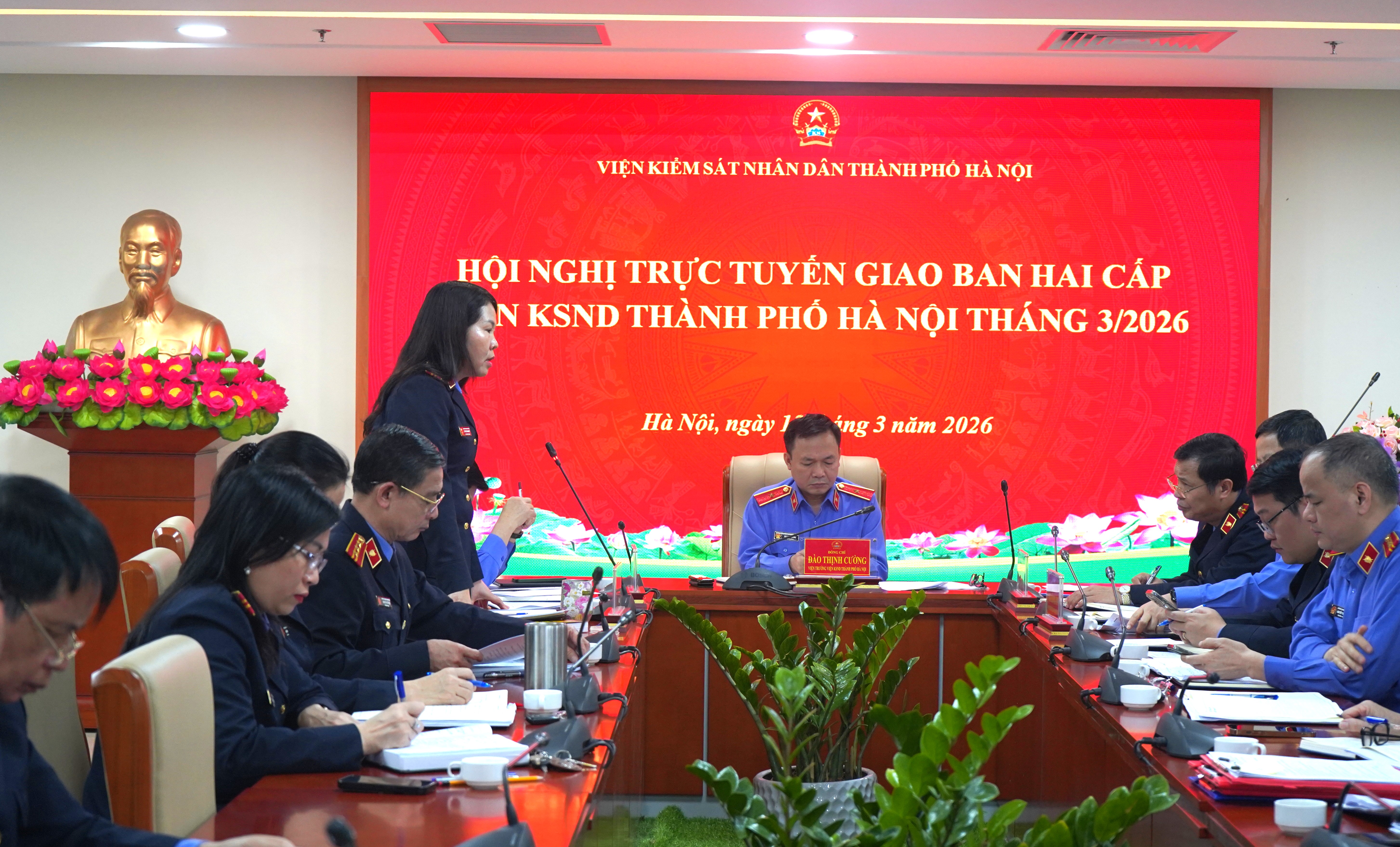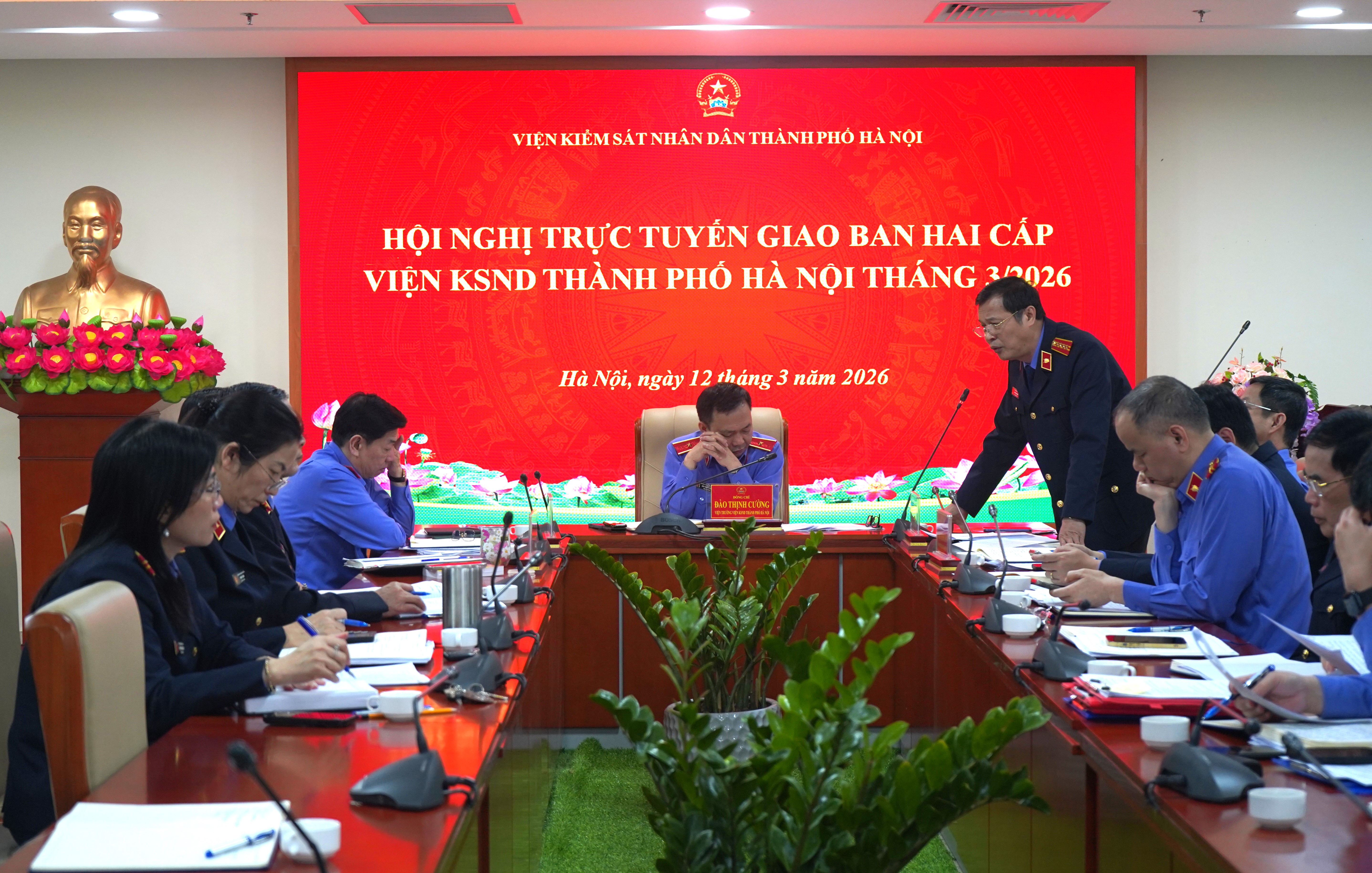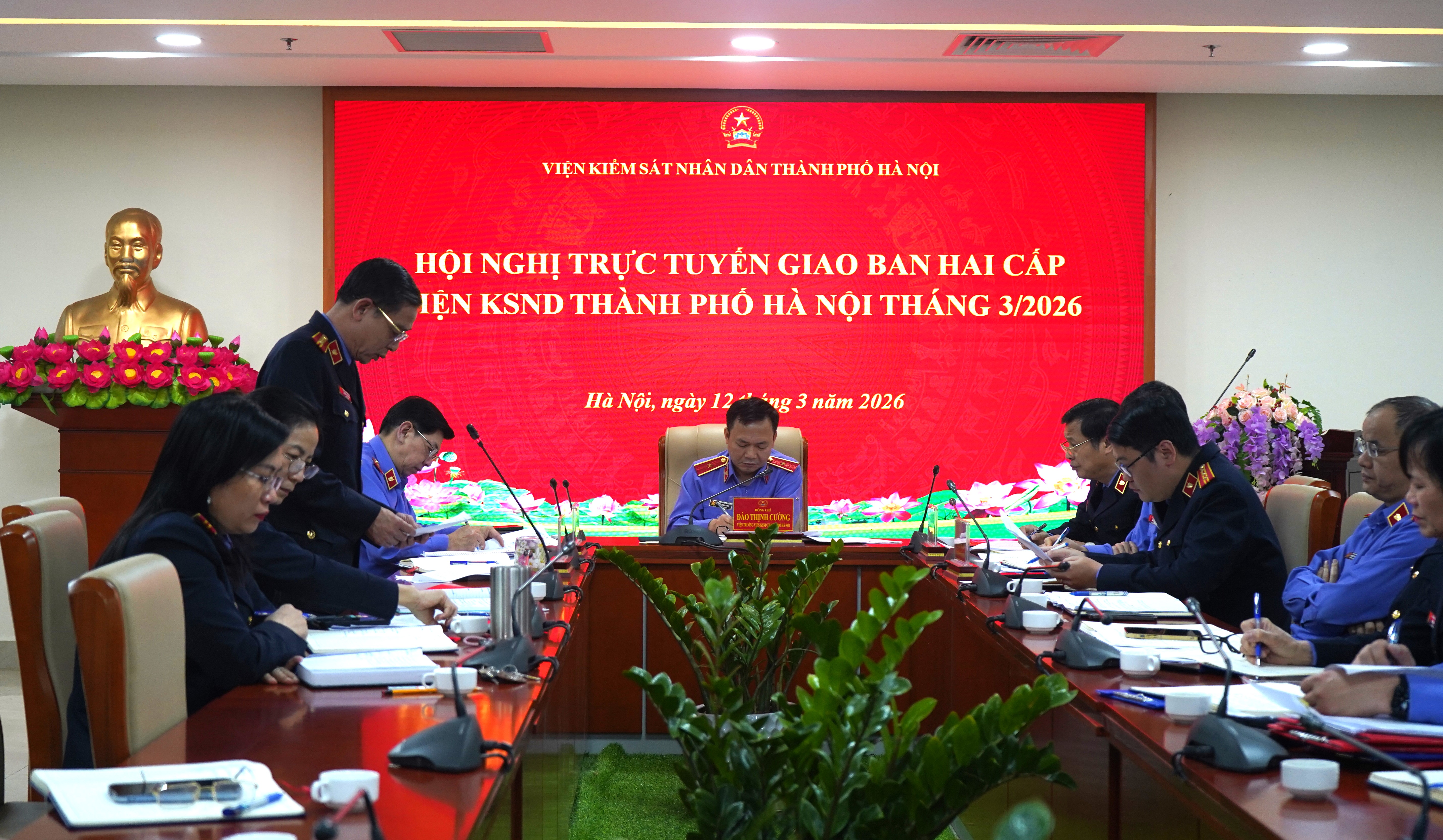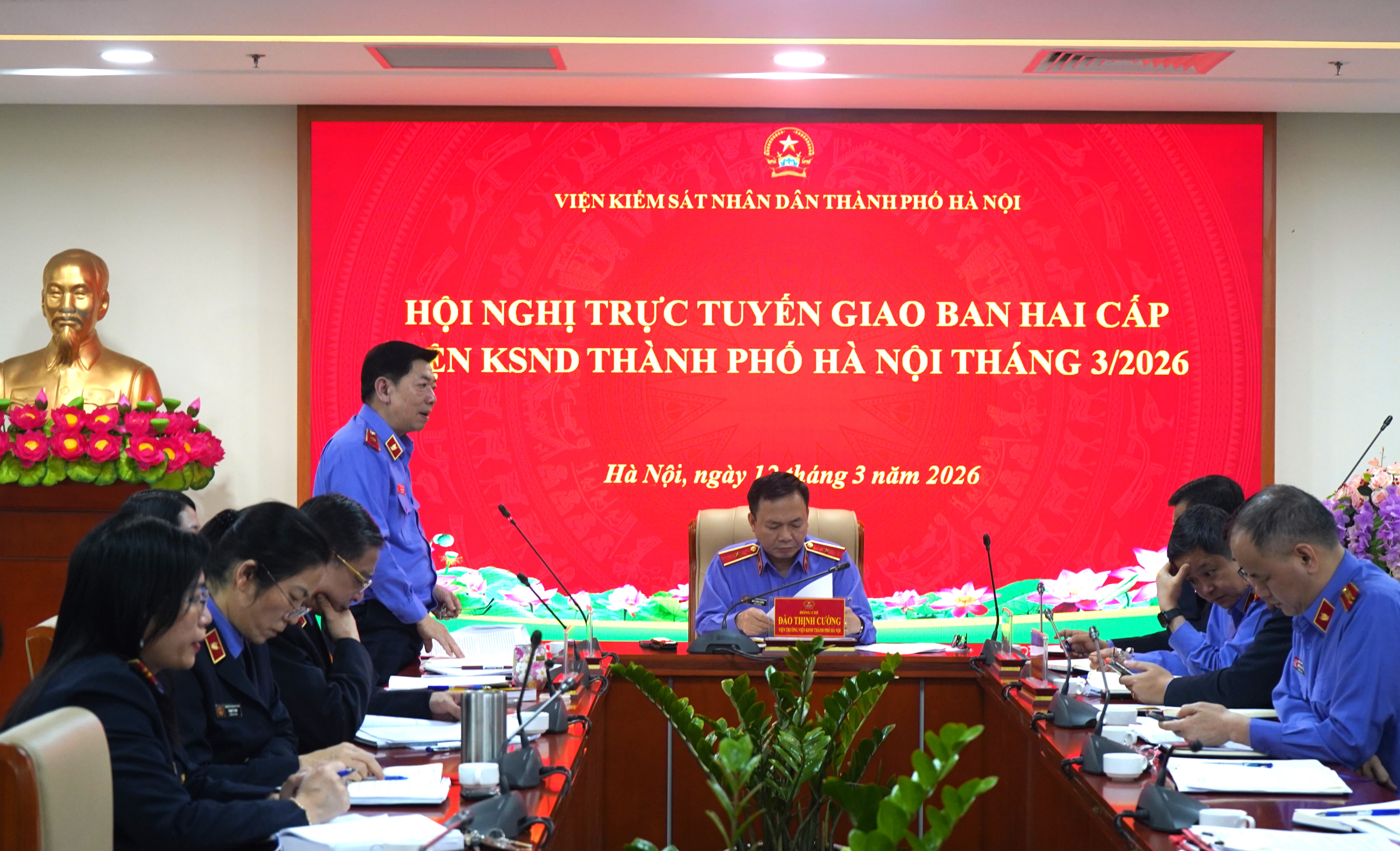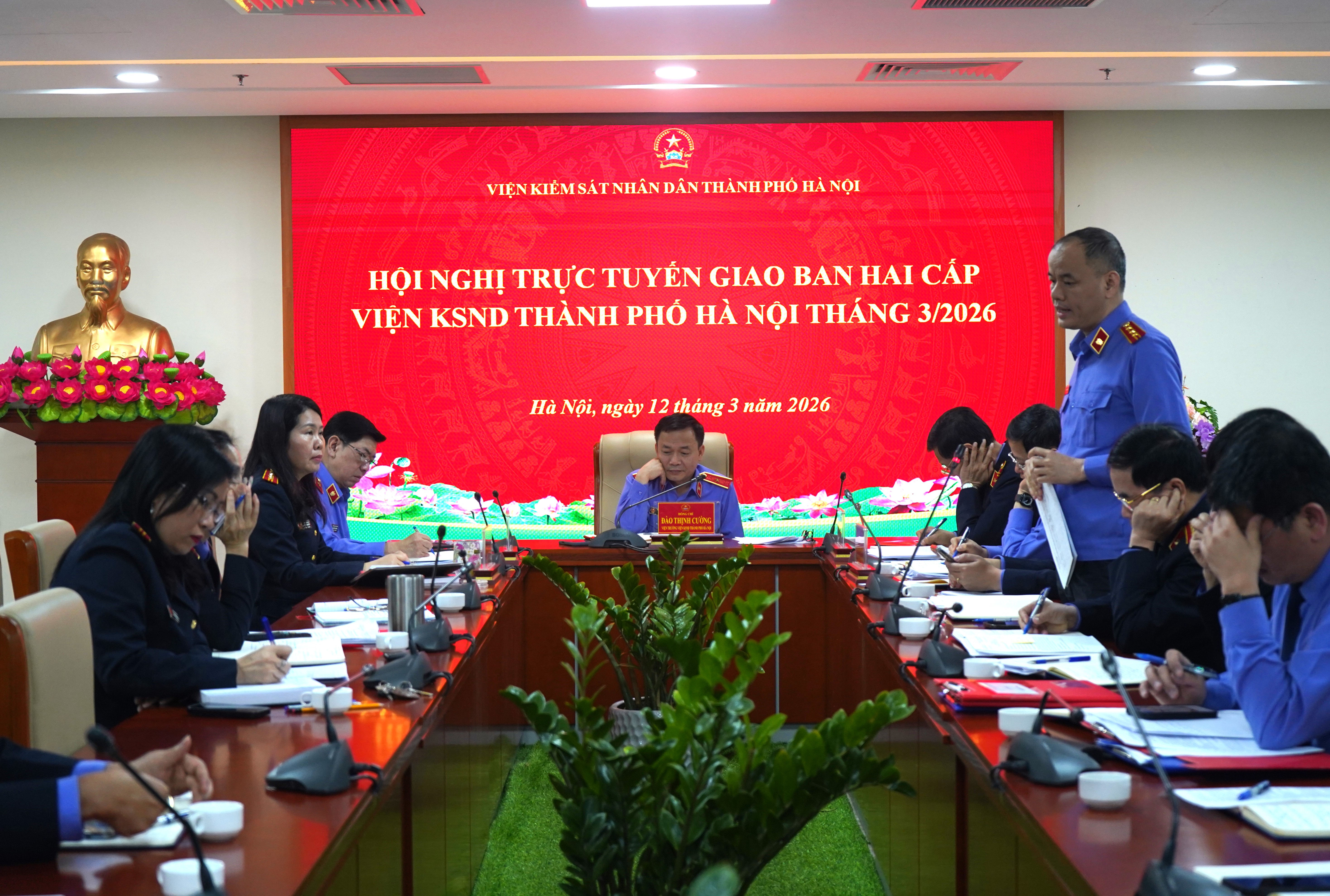 Ngày 12/03/2026, Viện KSND thành phố Hà Nội tổ chức Hội nghị trực tuyến giao ban hai cấp Thành phố tháng 03/2026. Đồng chí Đào Thịnh Cường – Thành ủy viên, Bí thư Đảng ủy, Viện trưởng Viện KSND thành phố Hà Nội dự và chủ trì Hội nghị. Hội nghị được tổ chức bằng hình thức trực tiếp tại Trụ sở Viện KSND thành phố Hà Nội và kết nối trực tuyến đến 12 điểm cầu Viện KSND khu vực.