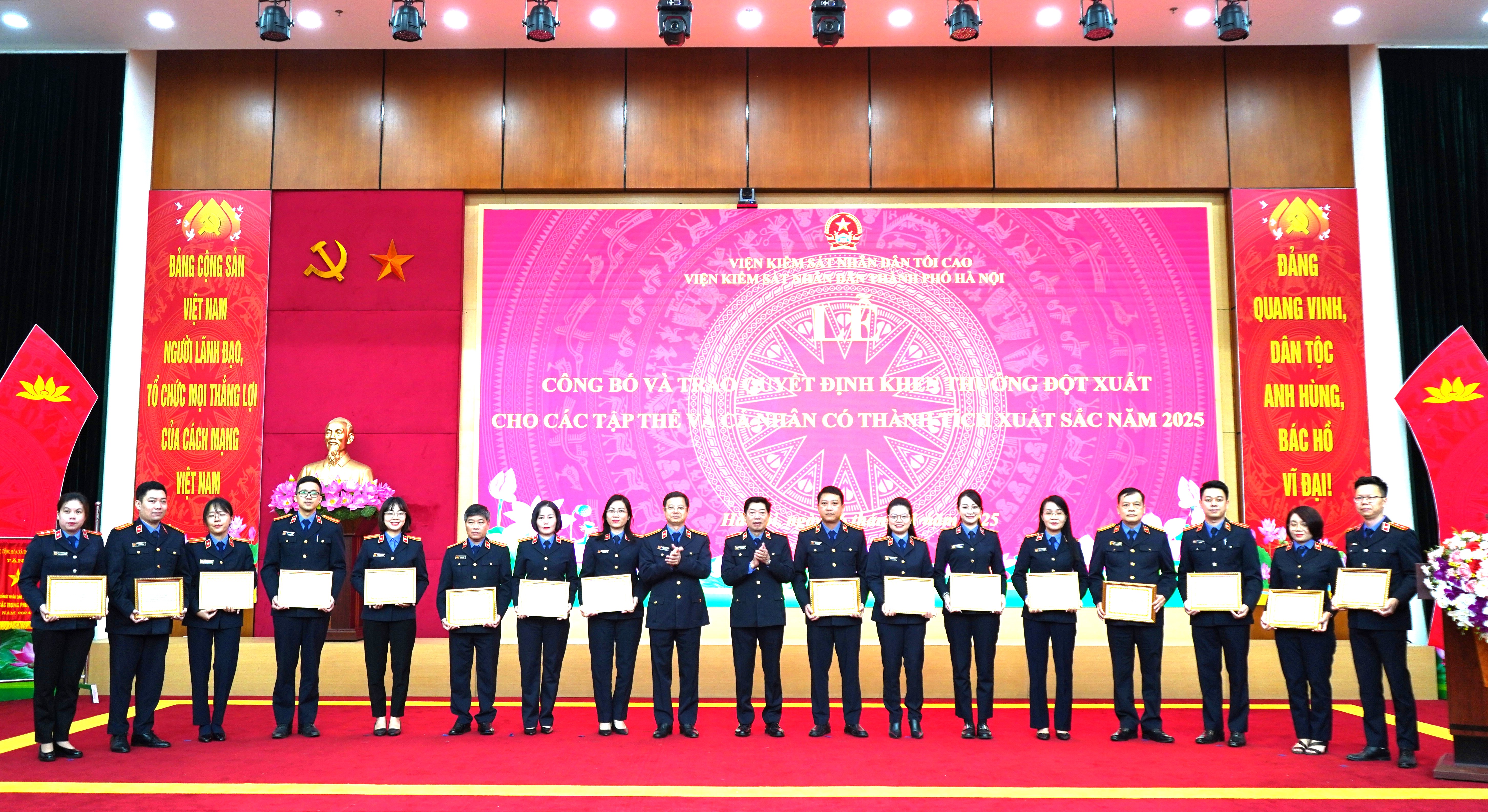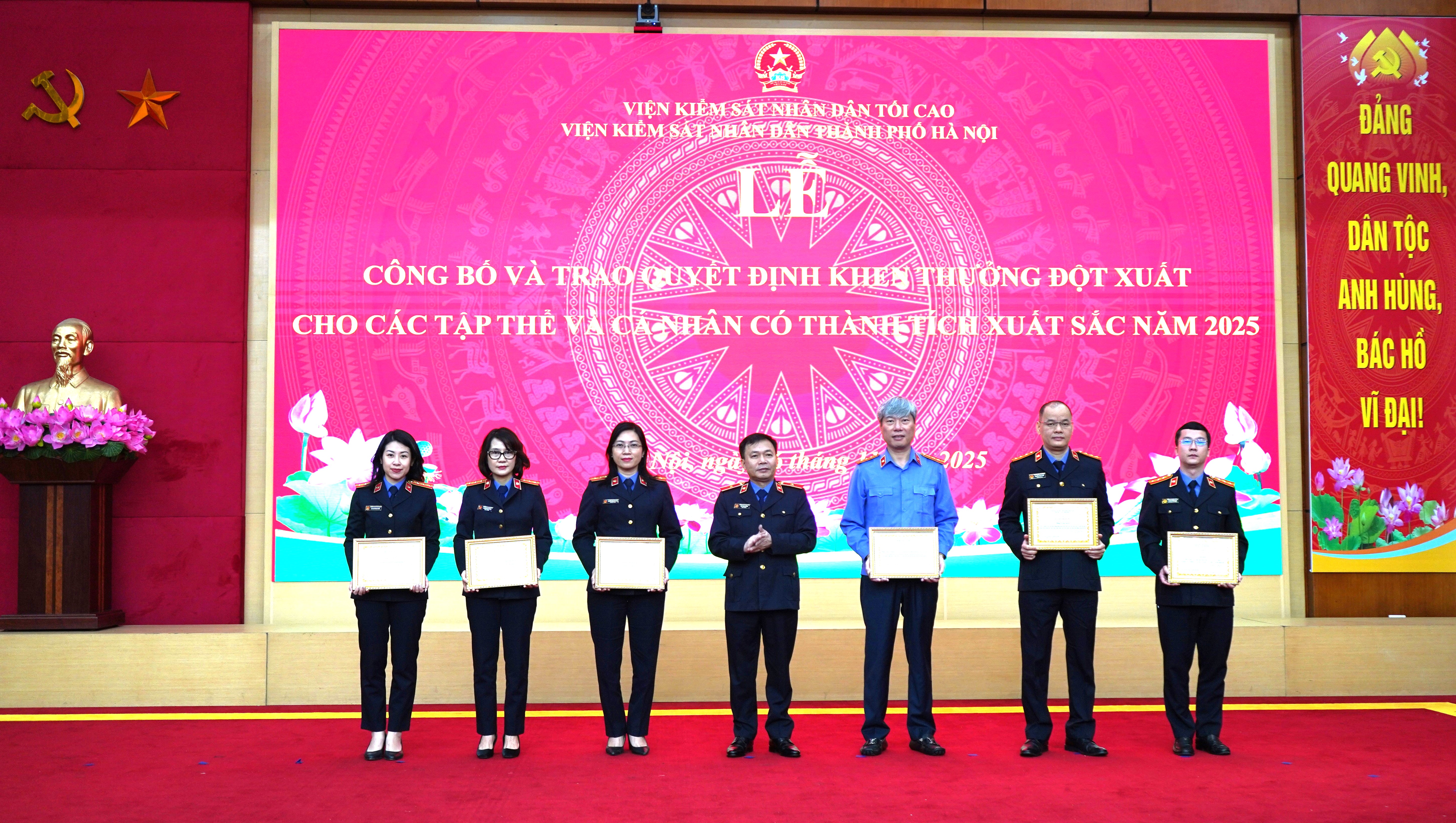 Cùng ngày, Viện KSND thành phố Hà Nội đã công bố các Quyết định của Viện trưởng Viện KSND thành phố Hà Nội về việc tặng Giấy khen đột xuất cho 06 tập thể và 17 cá nhân có thành tích đột xuất xuất sắc của Viện KSND hai cấp thành phố trong năm 2025 liên quan đến công tác nghiệp vụ, cũng như trong các phong trào thi đua và đặc biệt là hoạt động chào mừng 80 năm Ngày Quốc khánh nước Cộng hòa xã hội chủ nghĩa Việt Nam (02/9/1945 - 02/9/2025) và Lễ kỷ niệm 65 năm ngày Thành lập ngành Kiểm sát nhân dân.