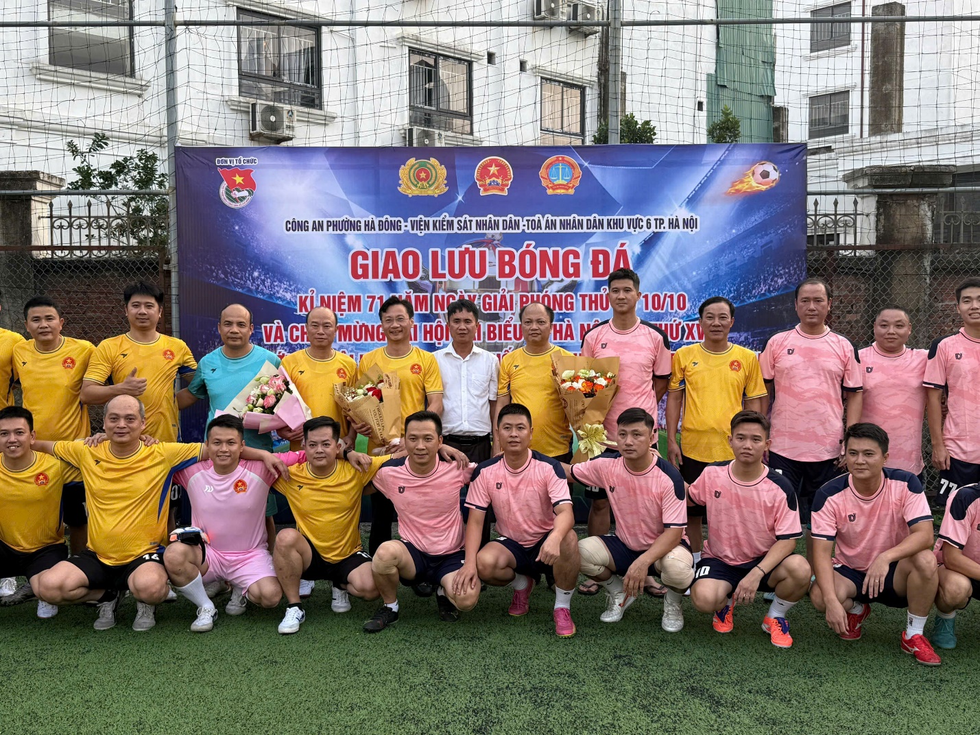 Để thiết thực chào mừng kỷ niệm 71 năm ngày Giải phóng Thủ đô (10/10/1954 - 10/10/2025) và Đại hội Đảng bộ thành phố Hà Nội lần thứ XVIII, đồng thời tăng cường phong trào rèn luyện sức khỏe, thể dục thể thao, giao lưu văn hóa, tạo sự đoàn kết gắn bó giữa các cơ quan tư pháp trong khu vực 6, thành phố Hà Nội. Chiều ngày 09/10/2025, tại sân bóng khu đô thị Văn Phú, phường Hà Đông, thành phố Hà Nội lãnh đạo các cơ quan Tư pháp khu vực 6 đã tổ chức trận giao hữu bóng đá giữa hai đội bóng: Liên quân Tòa án - Viện kiểm sát nhân dân khu vực 6 và đội Công an phường Hà Đông.