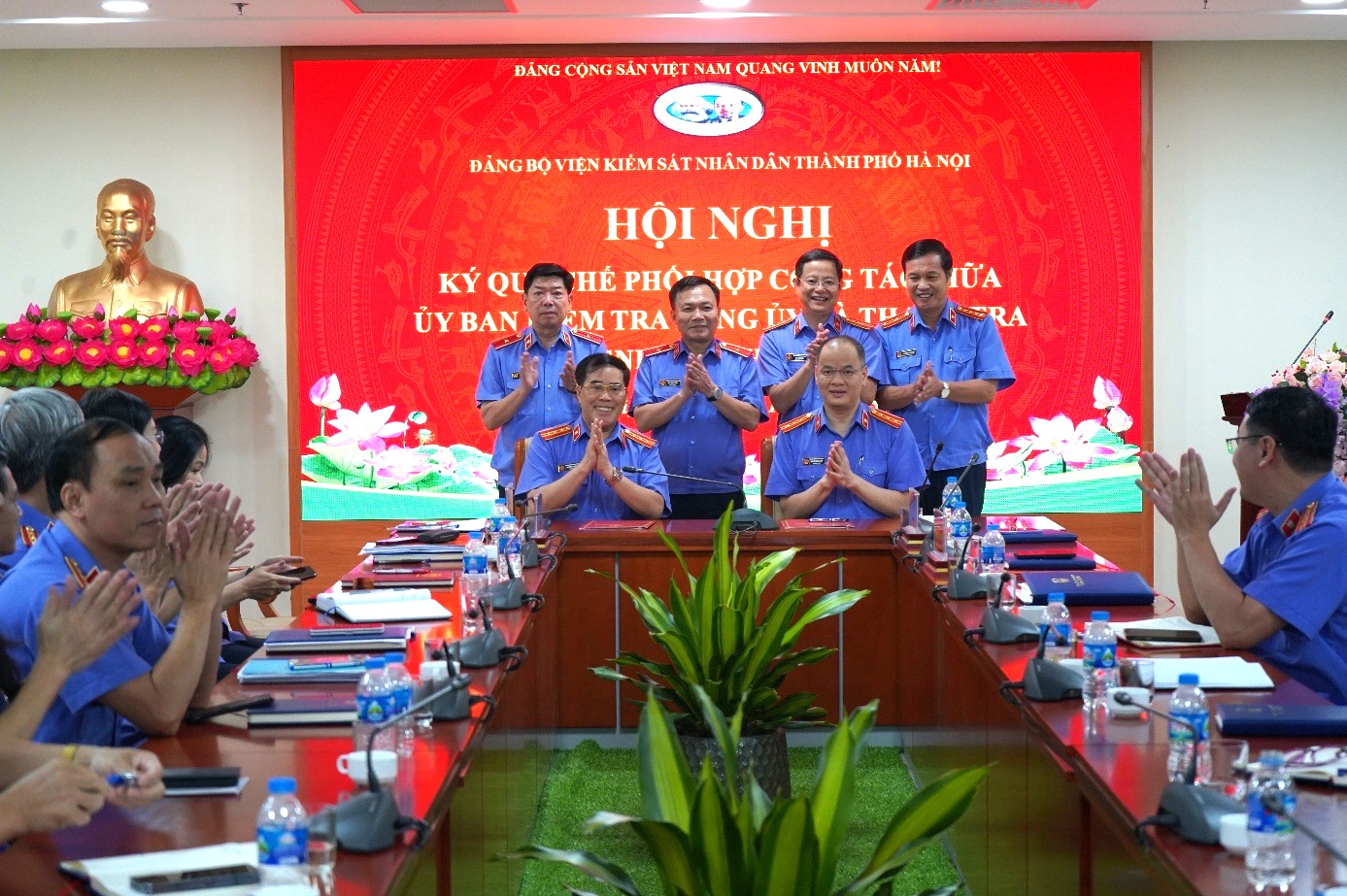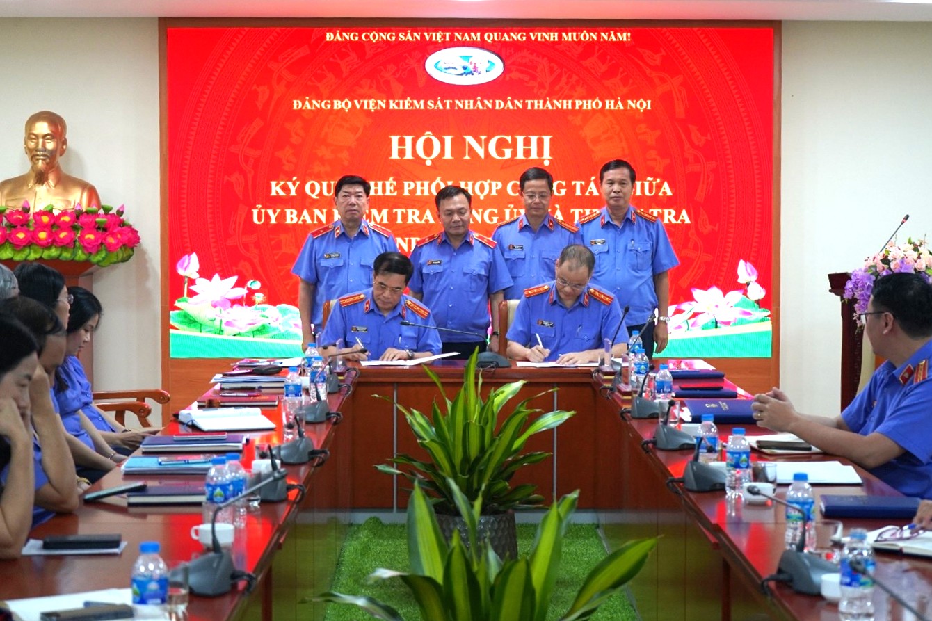 Dưới sự chứng kiến của đồng chí Đào Thịnh Cường - Thành ủy viên, Bí thư Đảng ủy, Viện trưởng Viện KSND thành phố Hà Nội; Ban Thường vụ Đảng ủy và Lãnh đạo Viện KSND thành phố Hà Nội, đồng chí Nguyễn Thành Thủy - Phó Chủ nhiệm UBKT Đảng ủy và đồng chí Nguyễn Nhật Thư - Chánh Thanh tra Viện KSND thành phố Hà Nội cùng ký vào bản Quy chế phối hợp công tác giữa hai đơn vị./.