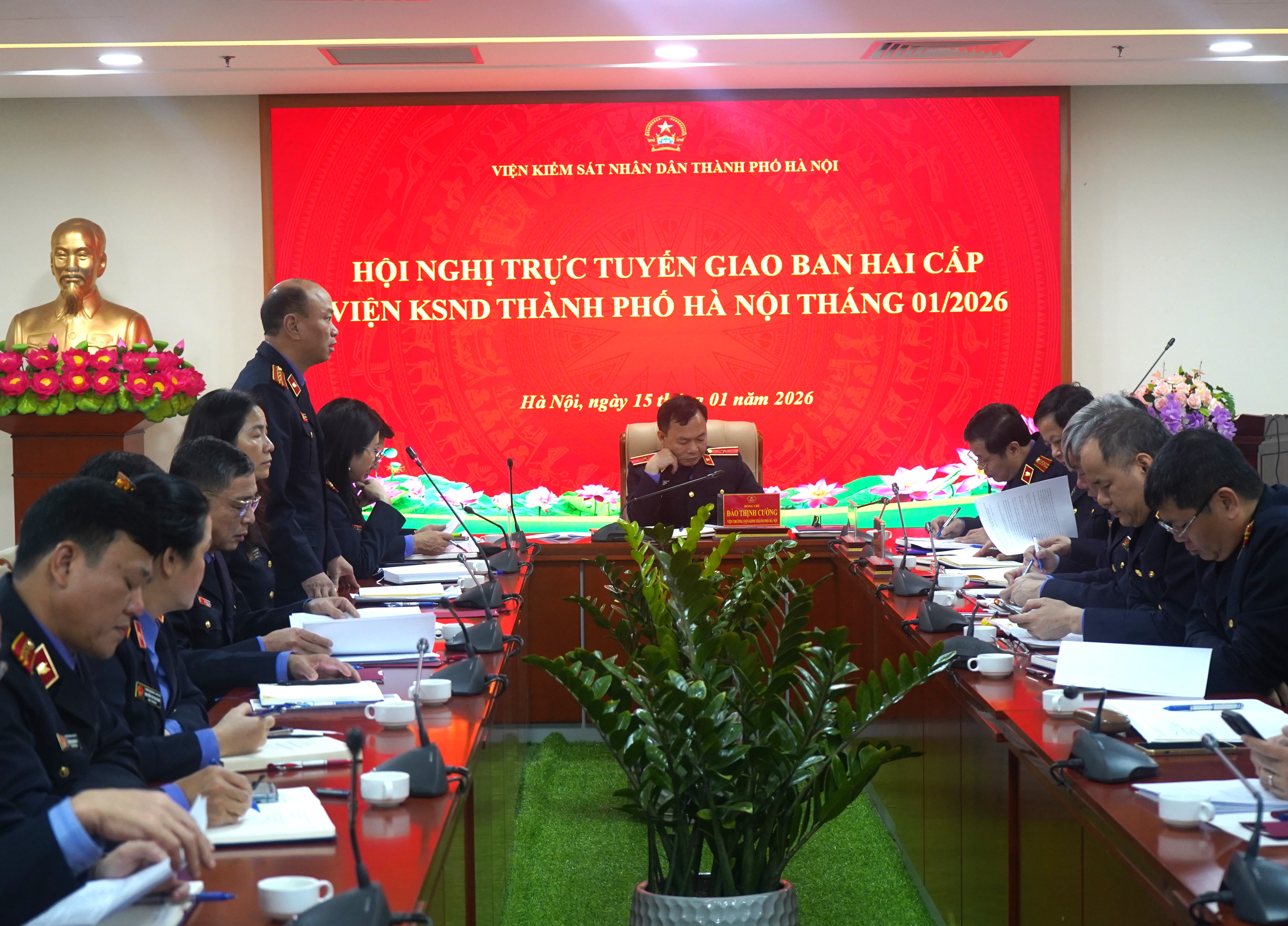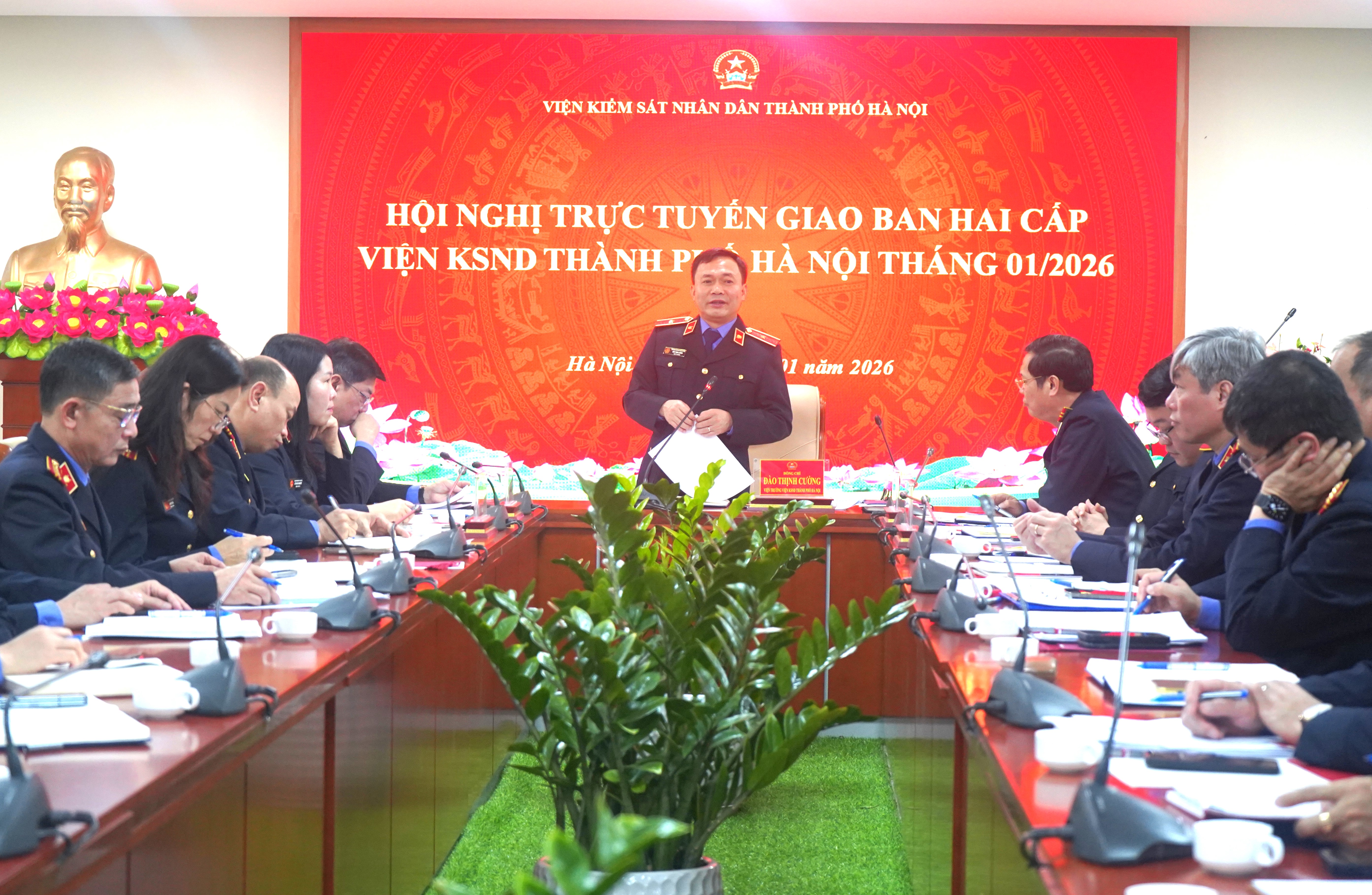 Ngày 15/01/2026, Viện KSND thành phố Hà Nội tổ chức Hội nghị trực tuyến giao ban hai cấp Thành phố tháng 01/2026. Đồng chí Đào Thịnh Cường – Thành ủy viên, Bí thư Đảng ủy, Viện trưởng Viện KSND thành phố Hà Nội dự và chủ trì Hội nghị. Hội nghị được tổ chức bằng hình thức trực tiếp tại Trụ sở Viện KSND thành phố Hà Nội và kết nối trực tuyến đến 12 điểm cầu Viện KSND khu vực.