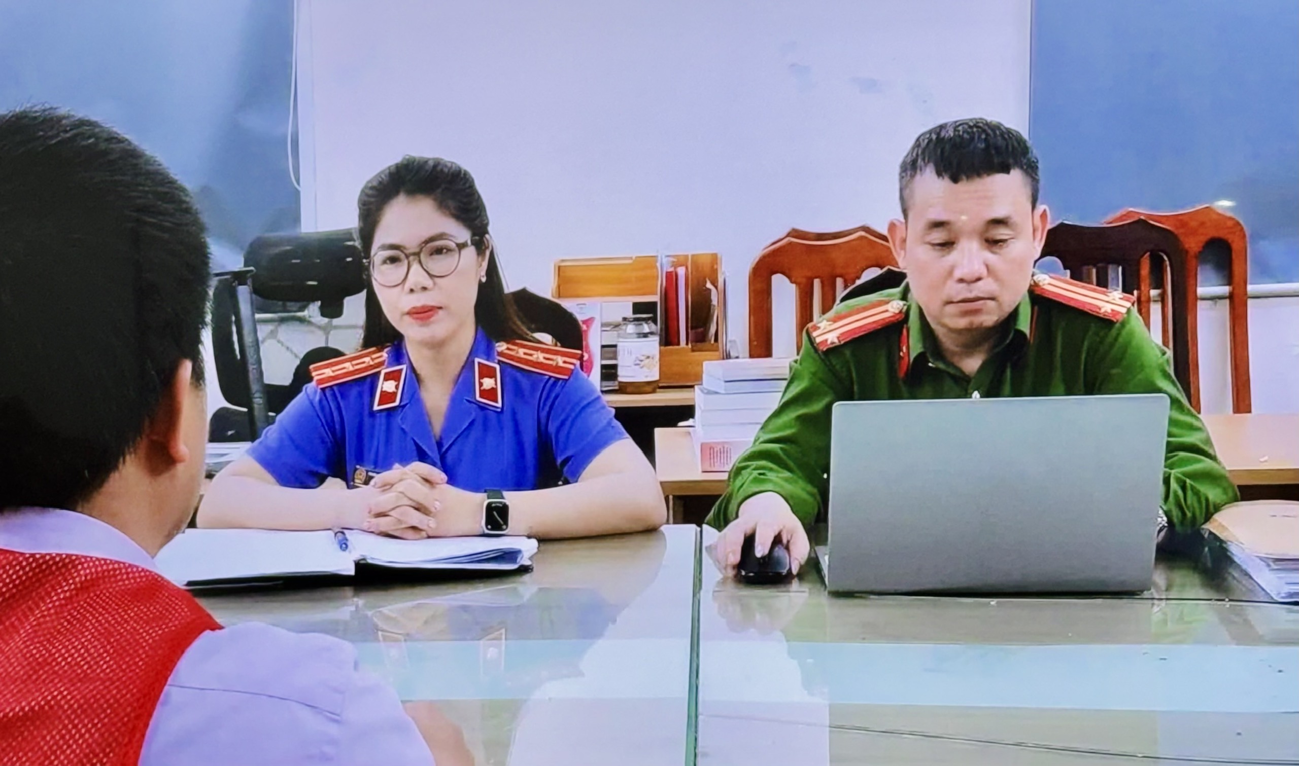 Kiểm sát viên Vũ Thị Khánh phối hợp cùng ĐTV tiến hành ghi lời khai đối tượng Đỗ Văn Thanh