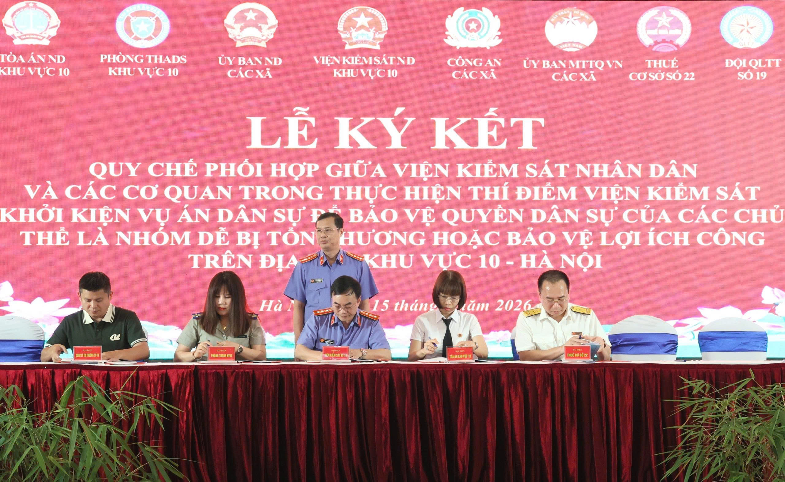 Tham dự buổi lễ có đồng chí Nguyễn Thanh Sơn - Ủy viên Ban Thường vụ Đảng ủy, Phó Viện trưởng VKSND thành phố Hà Nội; đồng chí Nguyễn Thị Diệp Liên - đại diện lãnh đạo Phòng 9 VKSND thành phố Hà Nội; cùng tập thể lãnh đạo, công chức Viện kiểm sát nhân dân Khu vực 10; Lãnh đạo Tòa án nhân dân Khu vực 10; cơ quan Thi hành án dân sự, cơ quan Thuế cơ sở, Đội Quản lý thị trường, đại diện cấp ủy, chính quyền địa phương, Ủy ban Mặt trận Tổ quốc Việt Nam và lực lượng Công an các xã trên địa bàn. Sự tham gia đầy đủ của các cơ quan, đơn vị thể hiện rõ tinh thần trách nhiệm, sự đồng thuận và quyết tâm chính trị cao trong việc triển khai cơ chế tố tụng công ích theo tinh thần Nghị quyết của Quốc hội.