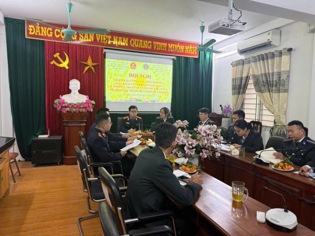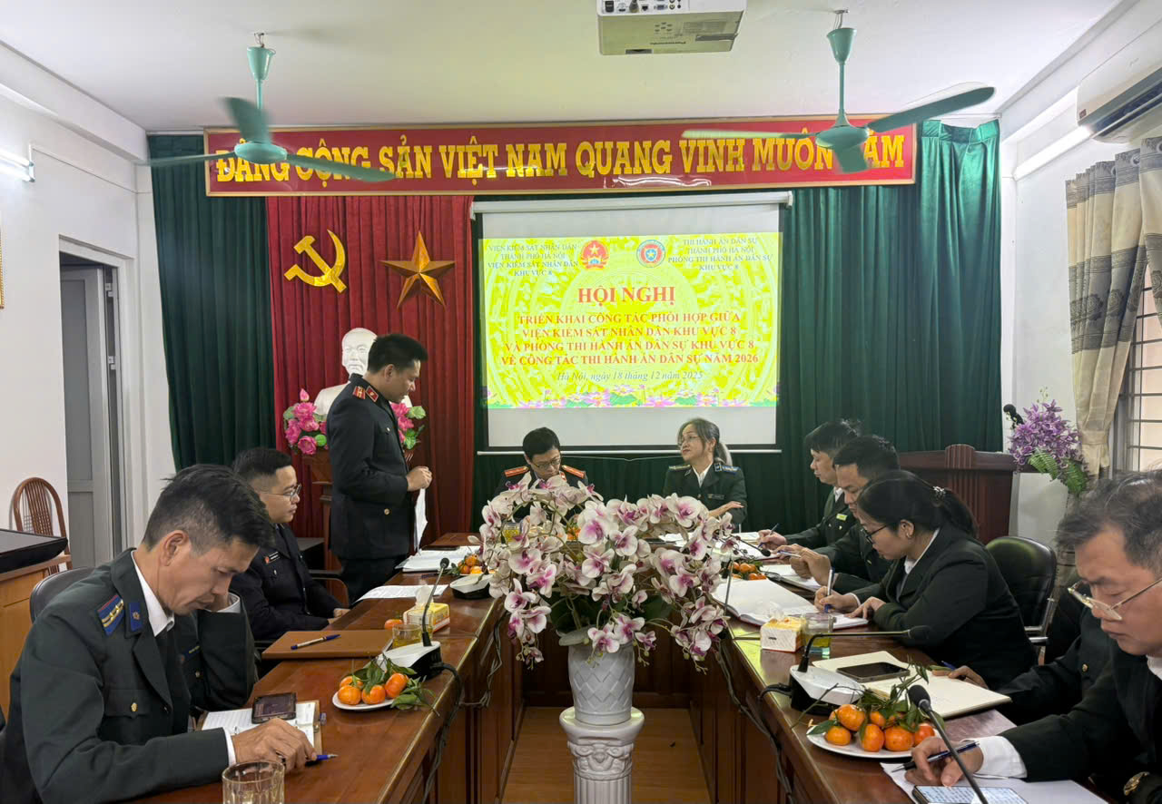 Ngày 18 tháng 12 năm 2025, tại trụ sở Phòng thi hành án dân sự khu vực 8 - Hà Nội, Viện KSND khu vực 8 phối hợp với Phòng thi hành án dân sự khu vực 8 tổ chức Hội nghị triển khai công tác phối hợp thống nhất những biện pháp, cách thức nâng cao hiệu lực, hiệu quả về công tác phối hợp sau sáp nhập giữa hai cơ quan. Hội nghị có sự tham dự của Đồng chí Trần Việt Phương - Phó viện trưởng cùng các đồng chí Kiểm sát viên, Kiểm tra viên, chuyên viên Viện KSND khu vực 8. Đồng chí Lê Thị Vĩnh Hà - Trưởng phòng cùng các đồng chí Phó Trưởng phòng, Chấp hành viên Phòng thi hành án dân sự khu vực 8.