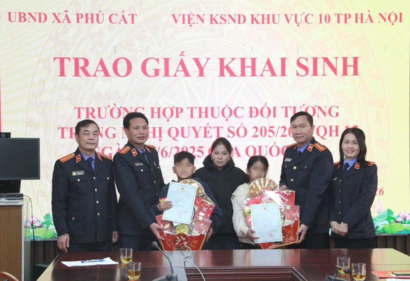 Chiều 9/2, tại UBND xã Phú Cát, Viện KSND Khu vực 10 - TP Hà Nội đã phối hợp với chính quyền địa phương tổ chức trao giấy khai sinh cho hai trẻ em trên địa bàn – những trường hợp trong suốt nhiều năm chưa được đăng ký khai sinh do vướng mắc về thủ tục hộ tịch và hoàn cảnh gia đình.
