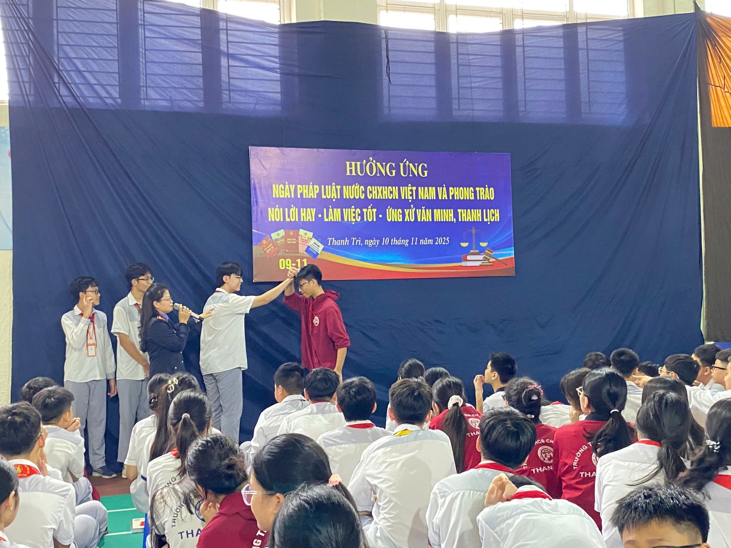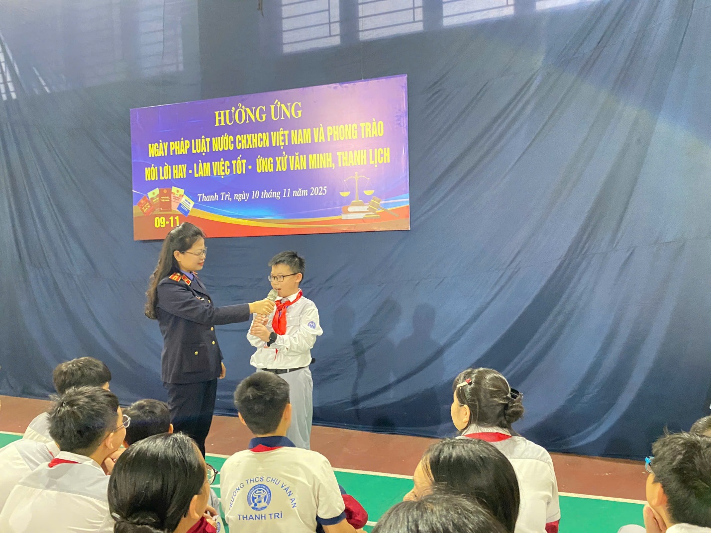 Hưởng ứng Ngày Pháp luật nước Cộng hòa xã hội chủ nghĩa Việt Nam và phong trào thi đua “Nói lời hay – Làm việc tốt – Ứng xử văn minh, thanh lịch”, sáng ngày 10/11/2025, Viện KSND khu vực 11, thành phố Hà Nội đã phối hợp với Trường THCS Chu Văn An, xã Thanh Trì, thành phố Hà Nội tổ chức buổi tuyên truyền pháp luật về phòng, chống bạo lực học đường và xây dựng văn hóa ứng xử trong trường học. Hoạt động nhằm giúp học sinh hiểu – biết – làm đúng pháp luật, nâng cao nhận thức, trách nhiệm cá nhân trong việc xây dựng môi trường học đường an toàn, thân thiện và giàu lòng nhân ái.