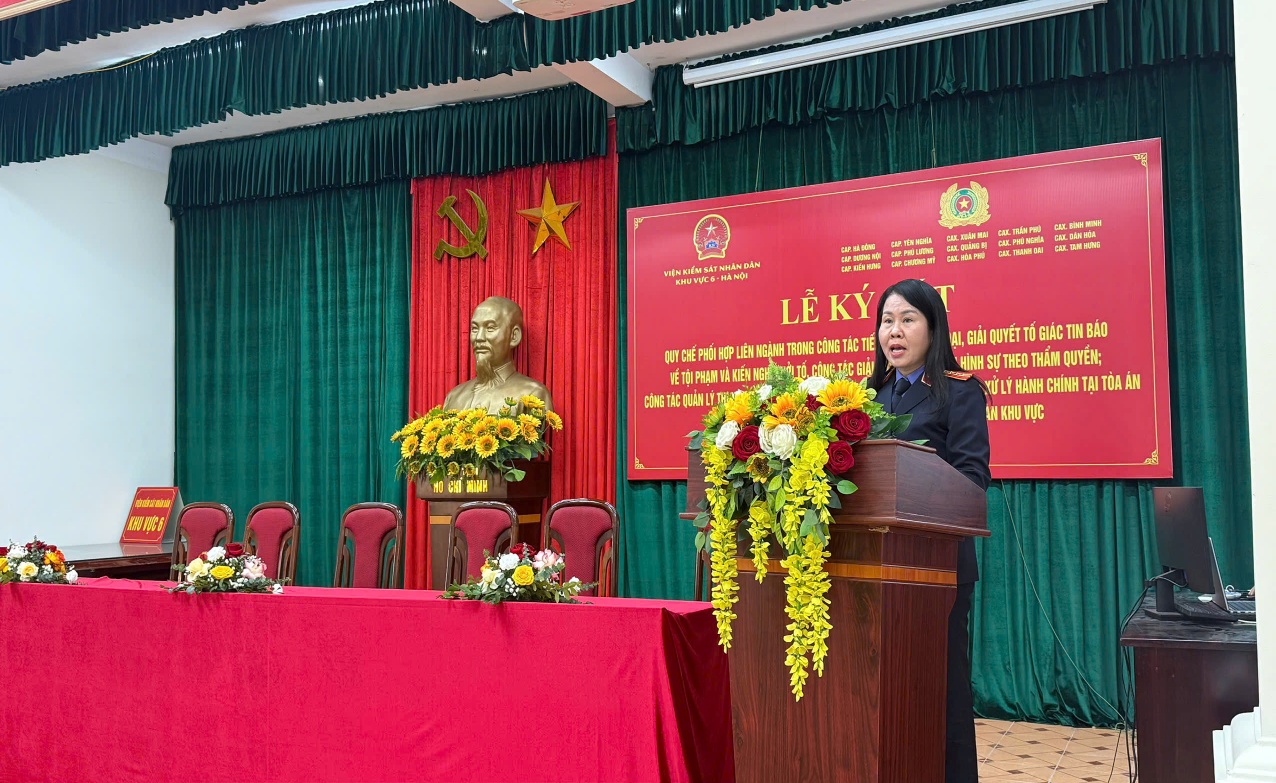 Phát biểu chỉ đạo tại buổi Lễ, đồng chí Lê Thị Thu Nguyệt – Phó Viện trưởng Viện KSND thành phố Hà Nội yêu cầu các đơn vị nghiêm túc quán triệt và triển khai thực hiện Quy chế đến toàn thể cán bộ, Điều tra viên, Kiểm sát viên; tăng cường phối hợp, thường xuyên trao đổi thông tin để kịp thời tháo gỡ những khó khăn, vướng mắc trong quá trình thực hiện. Đồng chí đề nghị định kỳ hai ngành tổ chức đánh giá kết quả công tác phối hợp, rà soát đánh giá và thống nhất bổ sung, điều chỉnh nội dung Quy chế cho phù hợp với yêu cầu và tình hình thực tế, bảo đảm Quy chế đi vào thực chất, hiệu quả.